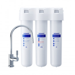 Обратноосмотические фильтры используются для абсолютной защиты от накипи, т.к. полностью устраняют соли жесткости из воды.нетЧисло ступеней очисткиКартриджи последовательно очищают воду и от видимых примесей, и от растворенных. Первый картридж задерживает более крупные частицы, а каждый последующий - более мелкие. Чем больше ступеней - тем лучше фильтр очистит воду: поймает более мелкие видимые частицы ржавчины, песка и ила, успеет захватить из воды максимум растворенных примесей - хлора, нитратов, тяжелых металлов и других.3МинерализацияПроисходит после финишной очистки воды. Необходима прежде всего в фильтре обратного осмоса, поскольку такой фильтр полностью устраняет из воды все примеси, в том числе минералы. Минералы добавляются в оптимальной концентрации - для пользы и привычного вкуса воды.нетПостфильтрацияФинальный этап очистки воды: картриджи постфильтрации удаляют самые мелкие механические частицы и кондиционируют воду, придавая ей более приятный вкус.нетНакопительная емкостьОбычно нужна в фильтрах обратного осмоса. Глубокая фильтрация требует времени. Чтобы Вам не приходилось ждать, пока вода наберется в чайник или кастрюлю, почти во всех моделях используется накопительный бак для чистой воды или другая емкость. В стандартном фильтре обратного осмоса под мойку воды в баке достаточно для семьи из 5-6 человек.нетФильтрующий модуль в комплектедаОтдельный крандаДавление в водопроводе не более, атмМаксимальное давление воды на входе в систему, при котором возможна стабильная работа фильтра.6,5Ширина, смОбратите внимание на габариты фильтра, и измерьте, сколько свободного пространства в предполагаемом месте установки.26,0Глубина, смОбратите внимание на габариты фильтра, и измерьте, сколько свободного пространства в предполагаемом месте установки.9,0Защита корпуса от гидроударовдаИсходная водаЖесткая вода – вода с избытком минеральных солей. От нее появляется накипь в чайнике, известковый налет на сантехнике и разводы на посуде. Мягкая вода – та, в которой мало минеральных солей. Нет накипи в чайнике и разводов на посуде. Фильтры для мутной воды и фильтры от ржавчины, как правило, имеют несколько стадий очистки и дополнительный полипропиленовый картридж. Он задерживает механические частицы ила, песка и ржавчины и защищает картриджи более глубокой очистки.мягкаяУстраняет мутностьМутность водопроводной воды может говорить о том, что в ней много мелких механических частиц. Важно, чтобы в фильтре был установлен дополнительные картридж механической предфильтрации (полипропиленовый) - он продлит жизнь остальным картриджам более тонкой очистки.нетУстраняет ржавчину, бурый осадокЛюбой фильтр под мойку удалит из воды крупные и мелкие частицы ржавчины. Некоторые фильтры имеют повышенный ресурс по железу: они дольше служат в такой воде, поскольку лучше подходят для удаления из воды железа и механических частиц ржавчины.нетЗащита от бактерийВсе проточные фильтры в той или иной степени защищают от бактерий. Например, добавление серебра препятствует их размножению. Это стандартная степень защиты. Если в семье есть дети, пожилые люди или аллергики, воду рекомендуется обеззараживать, то есть полностью удалять микроорганизмы. Повышенную защиту от бактерий дают фильтры с половолоконной мембраной. Это пучок тру
